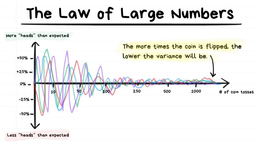 以文中示例来说,如果每笔交易的期望值为 10 美元,那么进行 1000 笔完全相同的交易后,你的预期利润约为 10 美元 ×1000 = 10,000 美元。