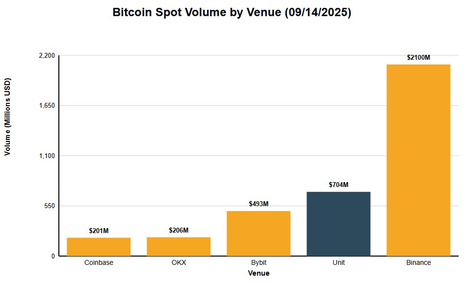 截至目前,HyperUnit 已处理了价值 7.18 亿美元的资产存款,涵盖 BTC、ETH、SOL 和 FARTCOIN,为现货资产提供了完全无需许可的高性能订单簿交易方式。自成立以来,HyperUnit 现货市场已执行了 405 亿美元的现货交易量,其中 Hyperliquid 上的比特币现货交易额达 214 亿美元。