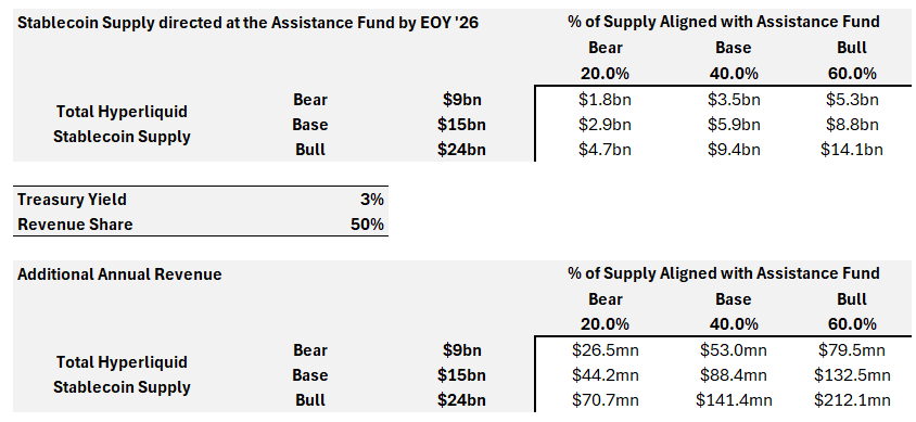 至关重要的是,我们预计随着上述 USDH 提案的实施,USDC 的主导地位将显著向 Hyperliquid 对齐稳定币迁移。假设根据最新的 FedWatch 概率,国库券收益率降至 3%,并且根据 USDH 提案,稳定币支持的收益的 50% 将流向援助基金,我们预计到 2026 年底协议将额外产生 1.1 亿美元的年度收入: