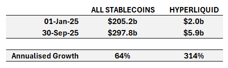 Hyperliquid 2025 年 USDC 增长率 (2025 年 1 月至 9 月)