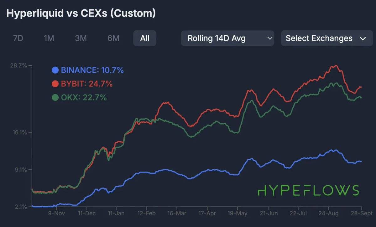 Hyperliquid 交易量 vs CEX 14 天滚动平均值(数据来源:Hypeflows.com)