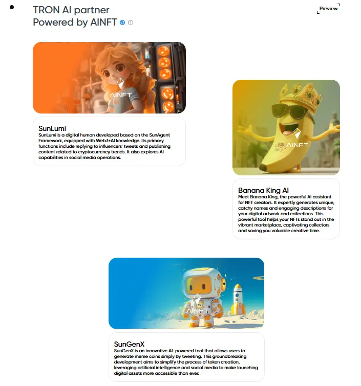 在生态落地层面,AINFT目前已成功聚合波场TRON生态中多个具象化AI产品,形成初步应用矩阵。例如基于SunAgent框架构建的数字人“SunLumi”、专为NFT创作者打造的AI智能助手“Banana King AI”,以及面向X平台的AI Agent Meme发行平台“SunGenX”等。这些产品覆盖虚拟数字人交互、创作辅助与内容发行等多类AI场景,不仅验证了AINFT技术框架的实用性与成熟度,也为后续生态的规模化扩展奠定了扎实的产品基础。