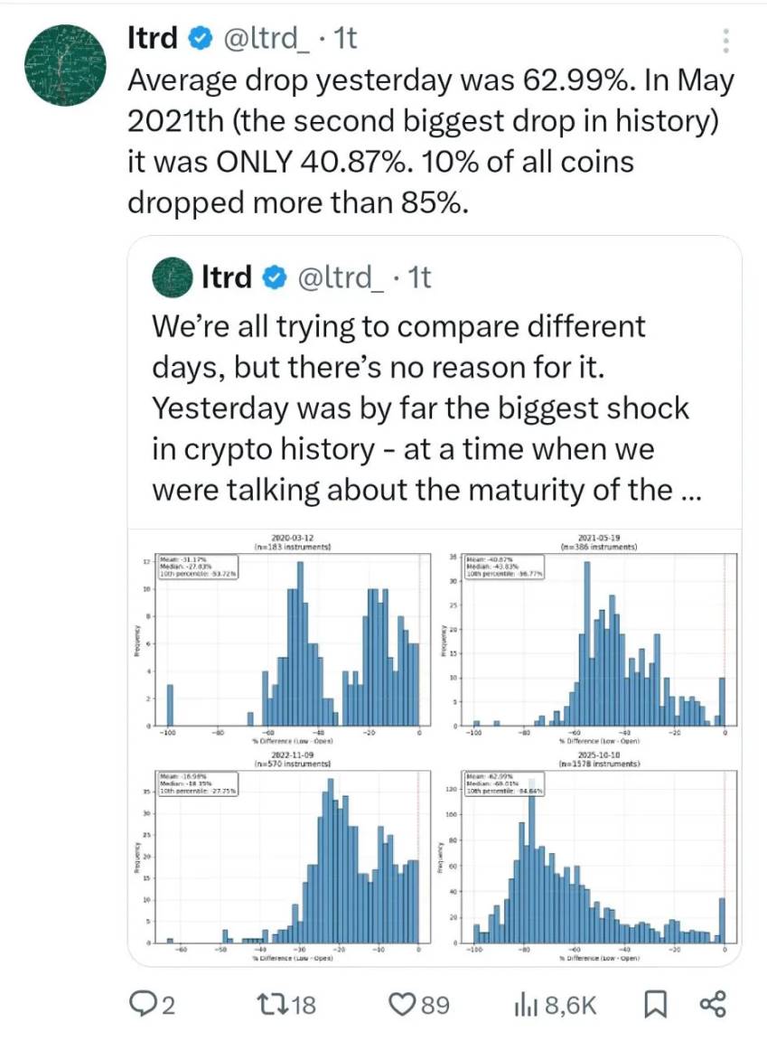 我日常通常使用 2-3 倍的低杠杆,目的是减少在中心化交易所(CEX)或去中心化交易所(DEX)所需的保证金。但此次崩盘仍让我感到震惊:山寨币平均跌幅达 62%,部分币种甚至暴跌 85%-99%—— 这意味着所有做多的杠杆交易者都已「爆仓」。过去几年,许多激进的交易者(圈内称「 degens 」)涌入加密货币交易市场,先是在 Solana 领域「厮杀」,随后又涉足永续合约。如今,杠杆交易已成为行业常态,我自己也每天都在使用杠杆。或许有人会指责这些交易者缺乏风险管理意识,但在我看来,2-3 倍杠杆其实已相当保守。而且说实话,我认为人们不会因为这次崩盘就放弃杠杆 —— 不出 1-2 周,那些激进交易者就会重返市场,仿佛什么都没发生过。