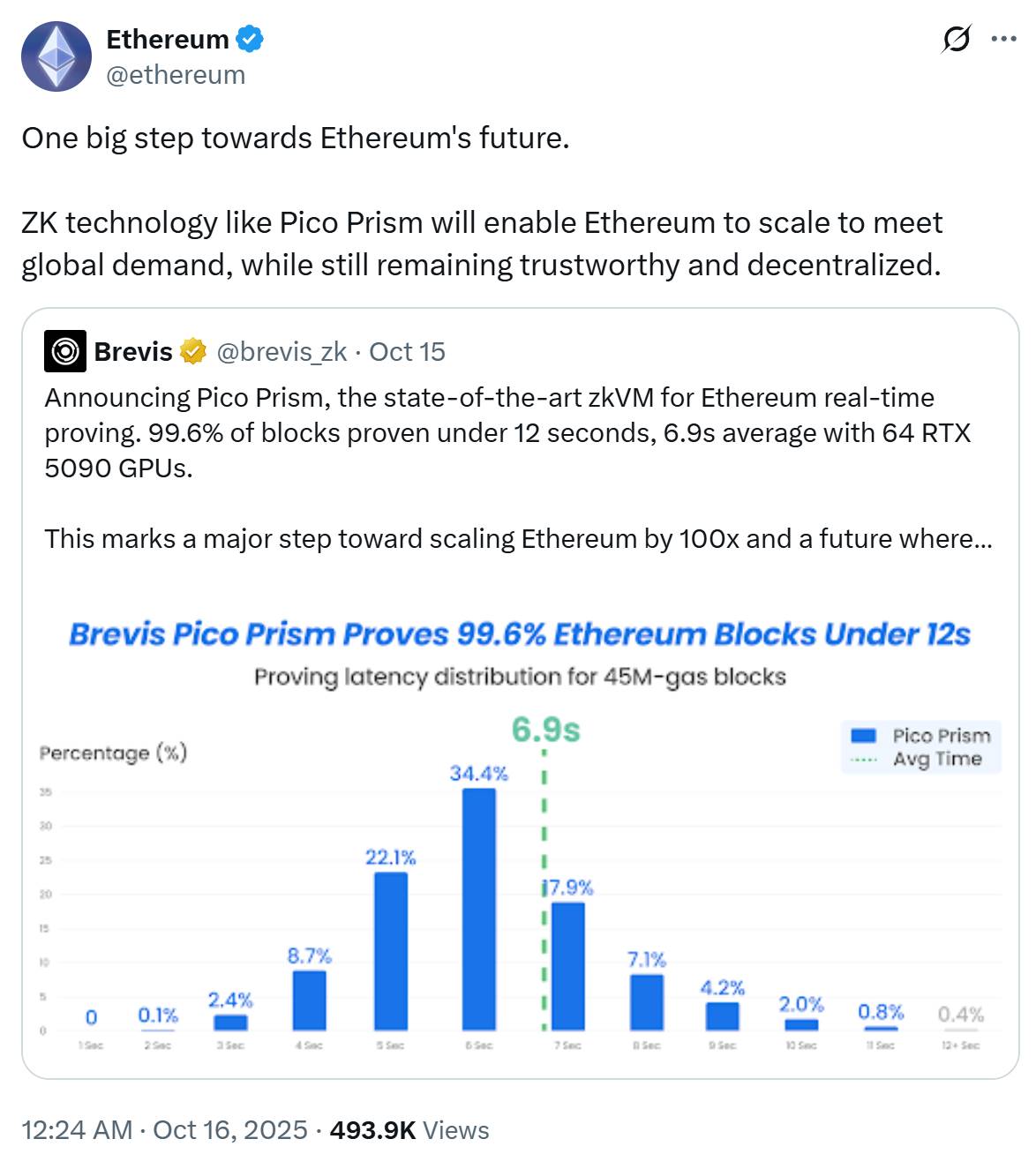 2025 年 10 月 15 日,ZK 全链数据计算和验证平台 Brevis 宣布其推出的 zkVM Pico Prism 已在消费级硬件上实现了以太坊实时证明:使用 64 块 RTX 5090 显卡,在 12 秒内完成了 99.6% 的以太坊 L1 区块证明,其中 96.8% 的区块证明时间低于以太坊基金会设定的 10 秒内标准。在 2025 年 9 月 1 日的测试中,在以太坊当前 45M 的 gas 限制情况下,Pico Prism 平均证明时间仅 6.9 秒。