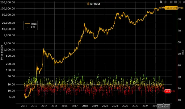 依據 Bitbo,至 10 月 17 日,比特幣 14 日 RSI 為 35.8,處相對弱勢區。RSI 低於 40 常代表空方動能占優,當前讀值接近輕度超賣邊緣。過去一週 RSI 自 10 月 10 日約 48 持續走低至 35.8,買盤動能明顯轉弱。