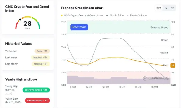 截至 10 月 17 日,恐懼與貪婪指數報 28,屬恐懼區,總體情緒偏謹慎與悲觀,風險偏好明顯下降、短線信心受壓。