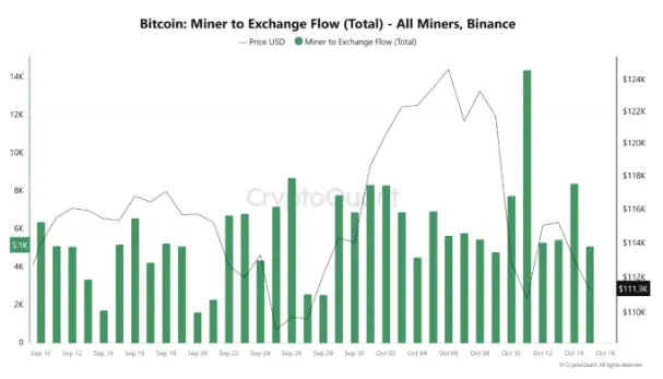 鏈上數據顯示,10 月 9 日至 10 月 16 日期間,礦工累計向幣安存入約 51,000 枚 BTC,創近月新高。分析指出,礦工短期集中轉入交易所通常意味由持有轉向出售,被視為對價格波動的預期反應。此舉對現貨供給構成短期壓力,進一步加劇資金流出效應。
