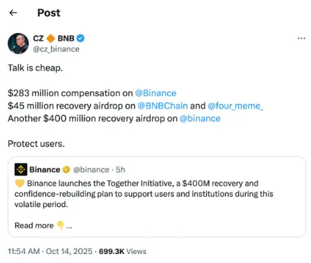 平台回應於 2025 年 10 月 11 日(週六)出現,交易所承諾針對 10 月 10 日去槓桿期間的系統故障造成的損失進行審查與補償。對比特幣而言,交易所韌性是市場風險溢價的核心。因停機導致的滑價與無法即時風控,會驅動用戶遷移至吞吐量更強的平台,並提升對於在壓力期間表現穩定的鏈上協議的使用。未來一個月,預期更多場域發布事後檢討與吞吐基準;波動尖峰時做市商將擴大點差。若中心化交易所事故頻仍、而去中心化場域續創紀錄,部分流量或結構性轉向鏈,但資本效率與預言機風險仍須考量。