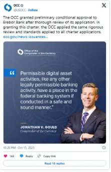 貨幣監理署核准 Erebor Bank 指向對加密相關銀行的較暖態度
