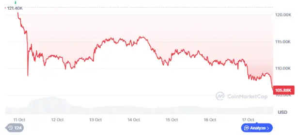 支撐:短線關鍵支撐位於 105,000、107,500 與 110,000 美元。10 月 11 日急跌觸及 105,000 美元後反彈,顯示買盤明顯。10 月 16 日靠近 110,000 美元止跌橫盤,顯示短線買盤干預。10 月 17 日回測 107,500 一線後企穩,顯示空方動能趨緩。若後續跌破 107,500,則下方 105,000 將成關鍵防守。
