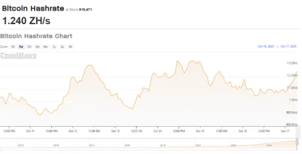 第二波峰後,線條回落至中段,於 1.1 ZH/s 附近震盪,至 10 月 17 日明確轉上,以區塊 919,471 的 1.240 ZH/s 收尾。末段抬升表示礦工在中週暫歇後再度加碼,受惠於電價與費用窗口,以及常態的礦池平衡。以 1.2 ZH/s 區域收盤顯示本週衝擊已被吸收,總算力回到高位。