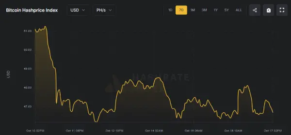 二次下壓回到 47.0 下方:中段回升後,於 10 月 14–16 日間多次低於 47.0。主因在於高位雜湊率基礎對較低的費用與價格形成壓力;網路持續高算力、難度滯後設計不變,等量雜湊競逐較少收入,使每 PH 收益再度被擠壓。