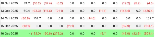 本週現貨比特幣 ETF 整體呈淨流出。四個交易日累計淨流出約 829 百萬美元,為近兩週最大撤出。10 月 16 日單日流出創階段新高,顯示短線機構防禦性轉強、情緒轉趨觀望。
