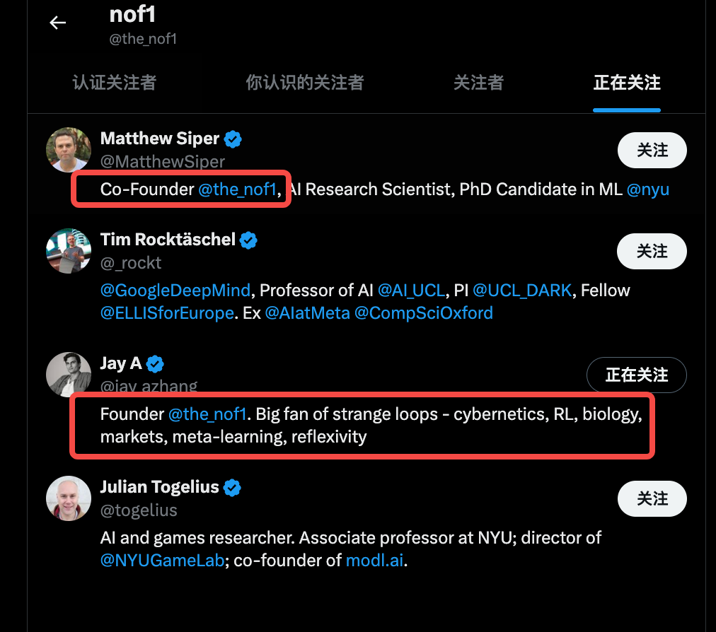 搞出这个 AI 交易大战的 nof1.ai,并没有太大的知名度。但是如果你看一下它社媒的关注列表,还是能找到一些蛛丝马迹。