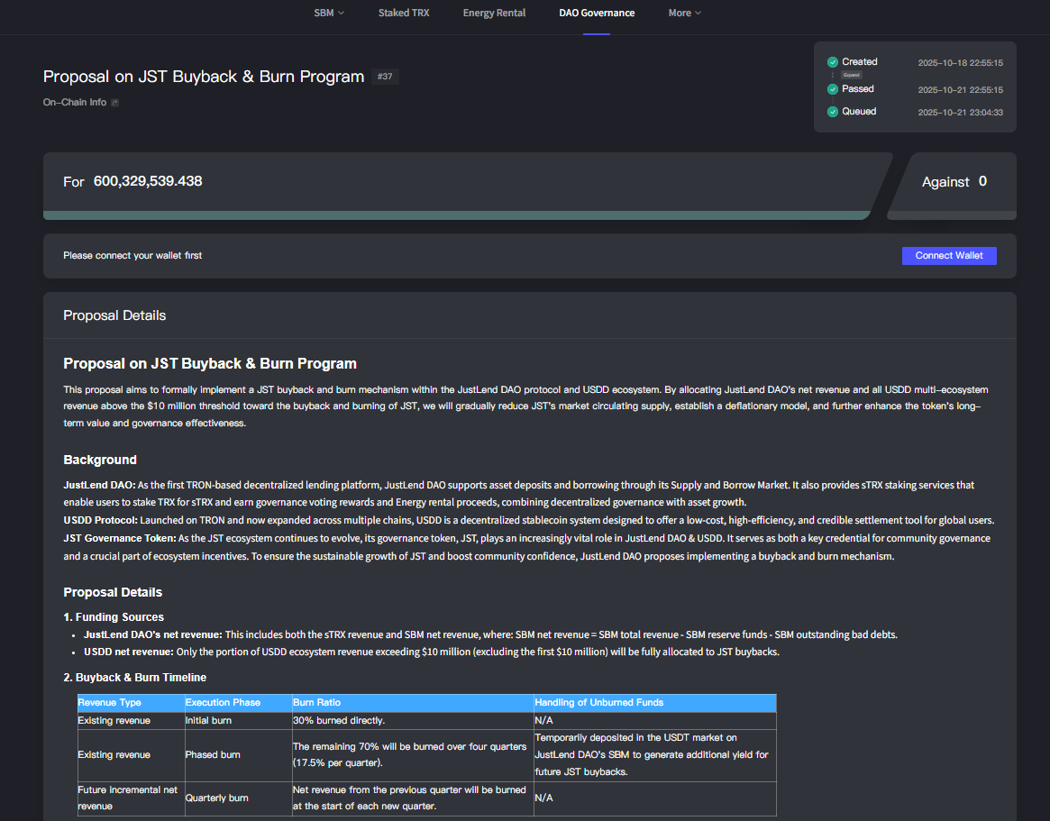 10月21日晚(SGT),波场TRON生态核心借贷协议JustLend DAO社区就“JST回购销毁”提案完成投票,最终以高额赞成票正式通过,标志着JST的通缩机制正式落地执行。