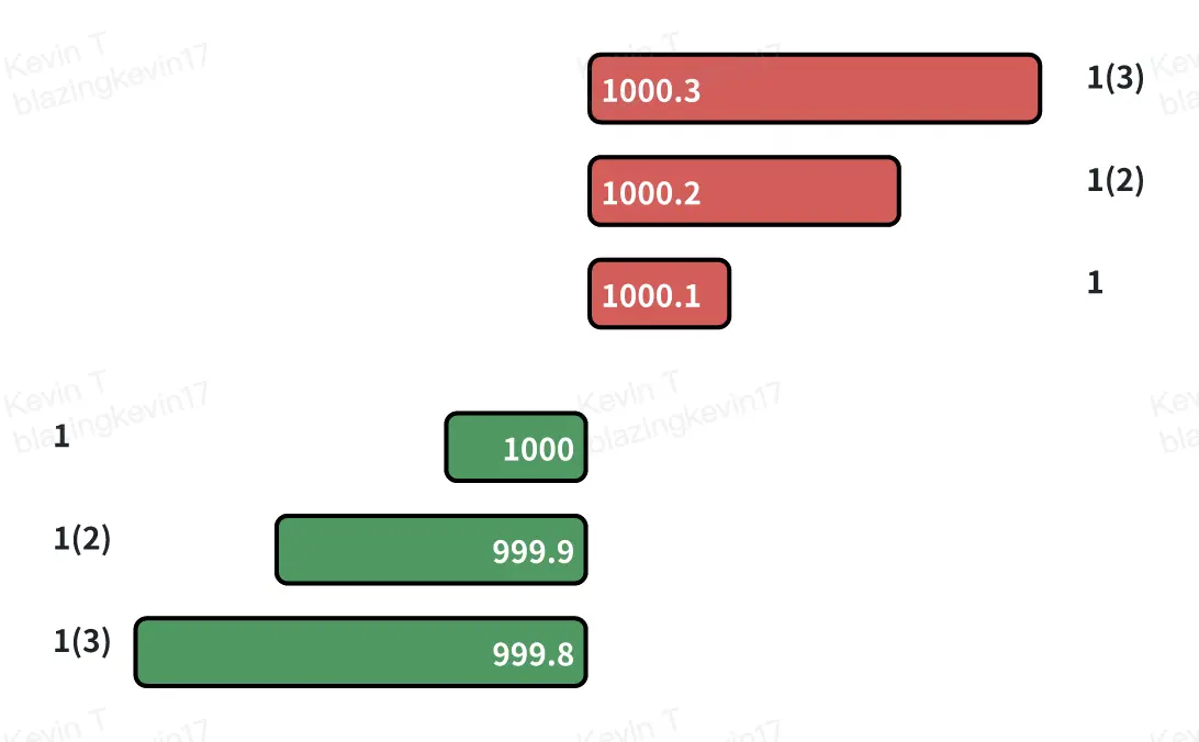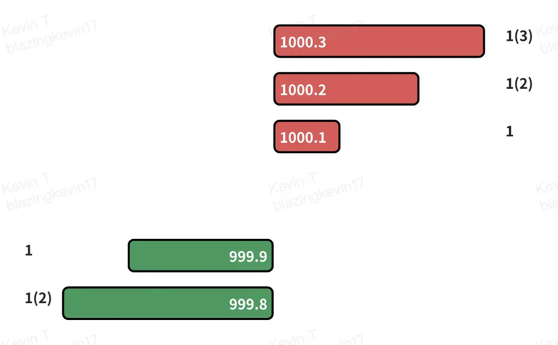 - 当前价差 (Spread): 最优买价 ($1000.0) 与最优卖价 ($1000.1) 之间的差额为 $0.1。