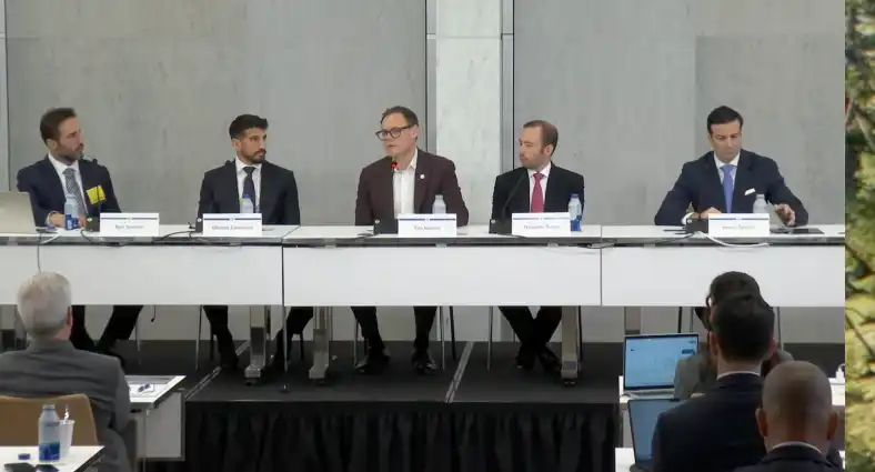 从左至右分别是 Jito Labs 的首席法务官丽贝卡·雷蒂格、Chainlink 的联合创始人谢尔盖·纳扎罗夫、Lead Bank CEO 杰基·雷塞斯、Fireblocks 的 CEO 迈克尔·肖洛夫、纽约梅隆银行的资金服务与存托凭证全球主管詹妮弗·巴克