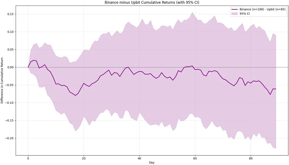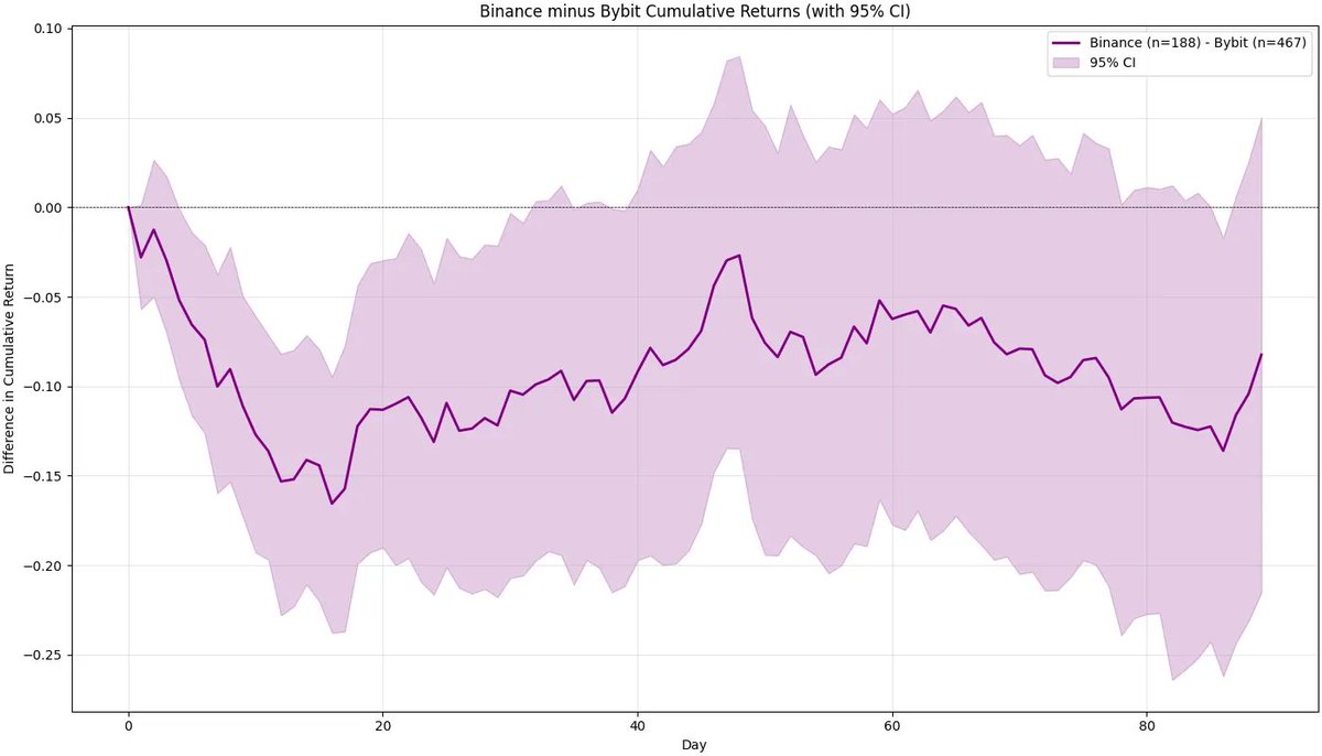 你可以清楚地看到——尤其是在 Coinbase 的例子中——币安的影响是正面的,而不是负面的。Coinbase 上的抛售压力远大于币安。当然,一旦考虑到置信区间,这种差异在 95% 的置信水平上不具有统计学意义——但结论仍然相当明确:币安上币的表现优于 Coinbase 上币。