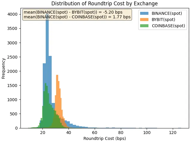 就 ONDO 而言,币安和 Coinbase 之间的往返成本大致相似 - Coinbase 略有优势(仅相差 1.77 个基点,可能是由于最小变动价位差异造成的)。