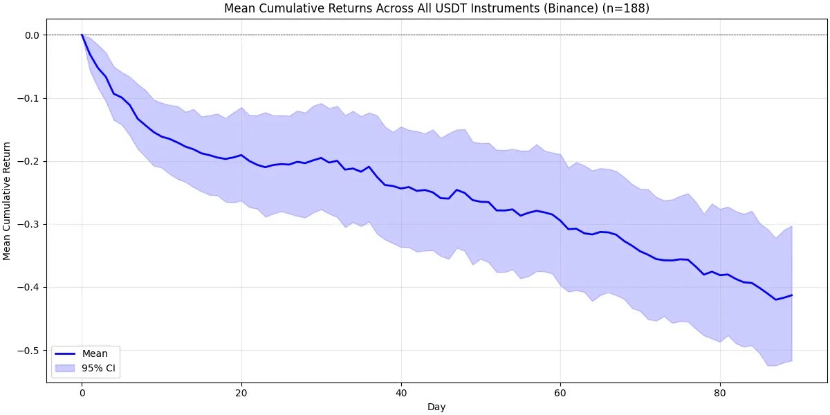 这是所有符合我标准的代币在币安现货市场上市后前 90 天的累计收益。我们看到了什么?从一开始就存在巨大的——绝对巨大的——抛售压力。几天后,情况稍微稳定下来,然后我们进入稳定的下跌趋势。为什么会这样?部分原因是由于整体加密货币市场趋势。平均而言,代币在上市后往往会向下波动。此外,我选取了 2022 年 1 月 1 日之后上线的所有代币,当时正值牛市之后,因此整体环境并不十分有利。