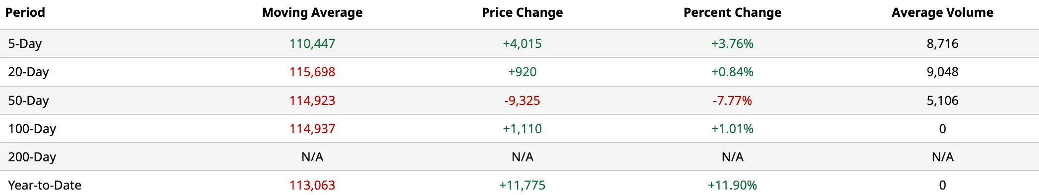 若价格能够重新站上 MA20(约 $115,700)并稳固于其上方,短期趋势有望由弱转稳;反之,若失守 MA5 并跌破 $110,000,下方可能再次测试 $107,000 甚至 $105,500 区域。