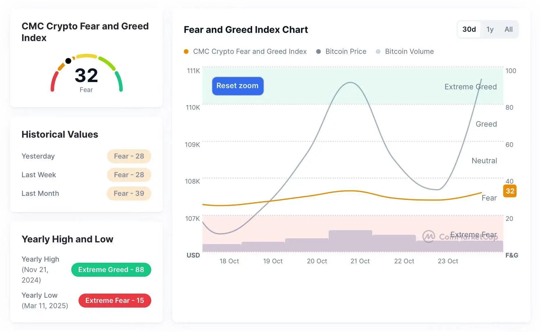 截至10月24日,恐惧与贪婪指数(Fear & Greed Index)报 32 点,位于“恐惧”(Fear)区间,显示市场整体情绪仍偏谨慎。投资者对比特币短期走势仍持观望态度,市场缺乏明显的风险偏好,情绪未出现明显回暖。