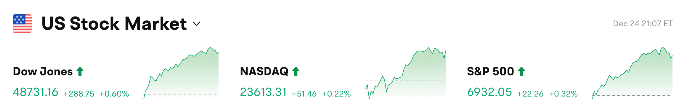 2、受圣诞假期影响,美股周三提前收市,道指初步收涨0.6%,标普500指数涨0.32%,纳指涨0.22%。此外,现货黄金跌破4450美元,日内下跌0.78%。