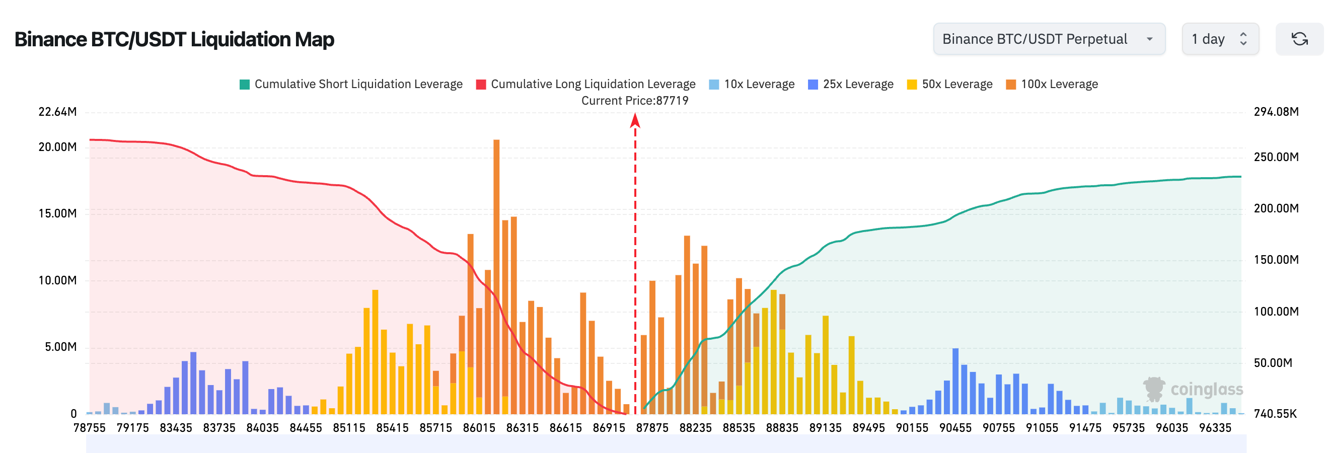 3、Bitget BTC/USDT清算地图显示:当前价格附近(约 87,700 美元)多空杠杆高度集中,短期波动极易触发连环清算。上方约 88,500–90,000 区间空头清算密集、下方 86,000 一带多头风险较高,行情更可能被“挤向”流动性更密集的一侧。