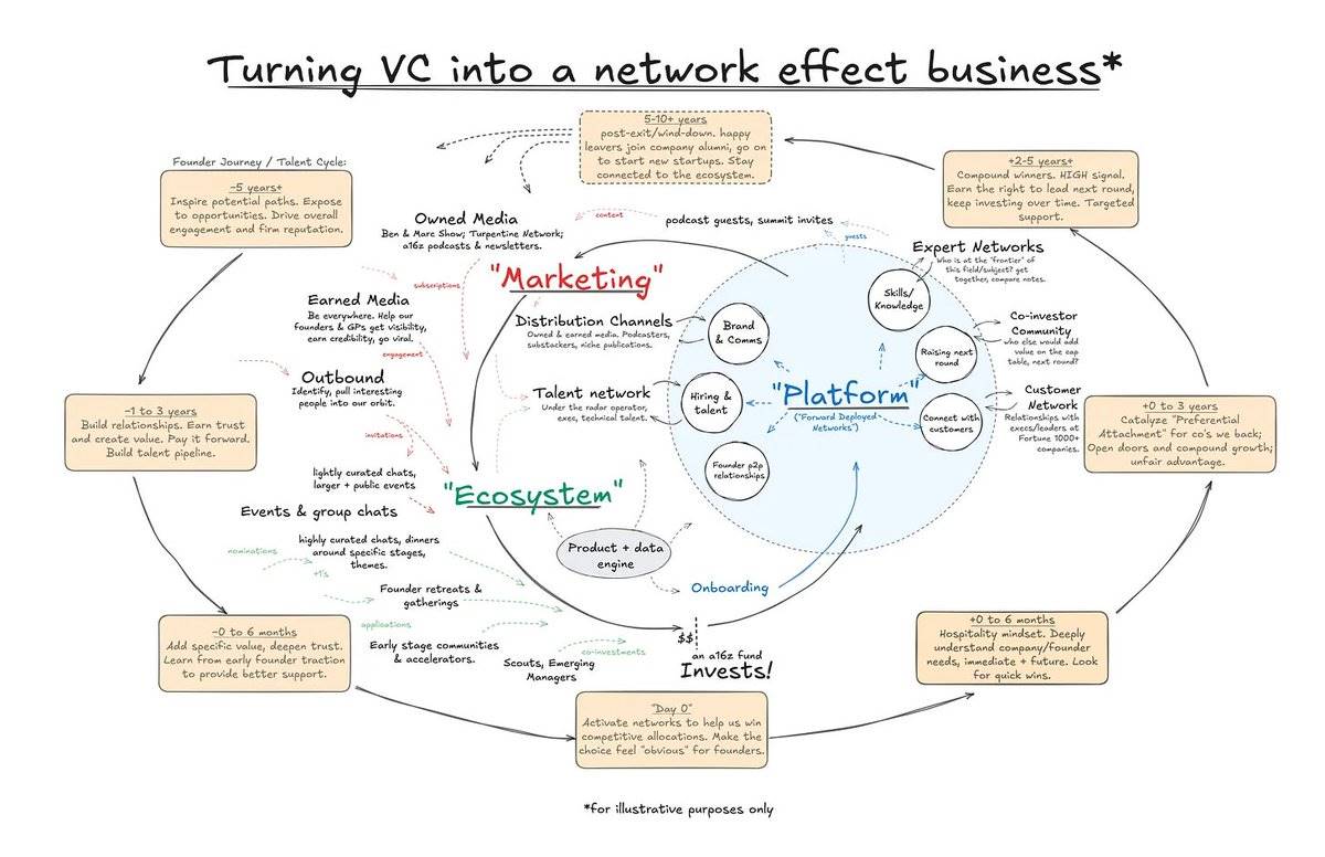 2025年10月,David Booth(@david__booth)加入a16z,担任合伙人兼生态系统负责人,专注于构建他称为“优先依附”(preferential attachment)机制的基础设施。这套机制旨在让资源、人才和关注度更倾向于流向a16z的投资组合公司,而非竞争对手。正如Marc Andreessen(@pmarca)在宣布Booth加入时所解释的那样,初创公司需要进入一个“资源不断积累的循环中……从合格的高管、技术员工,到未来的后续融资、品牌正向势能、公众认知、客户、营收,甚至在政府中的影响力”。