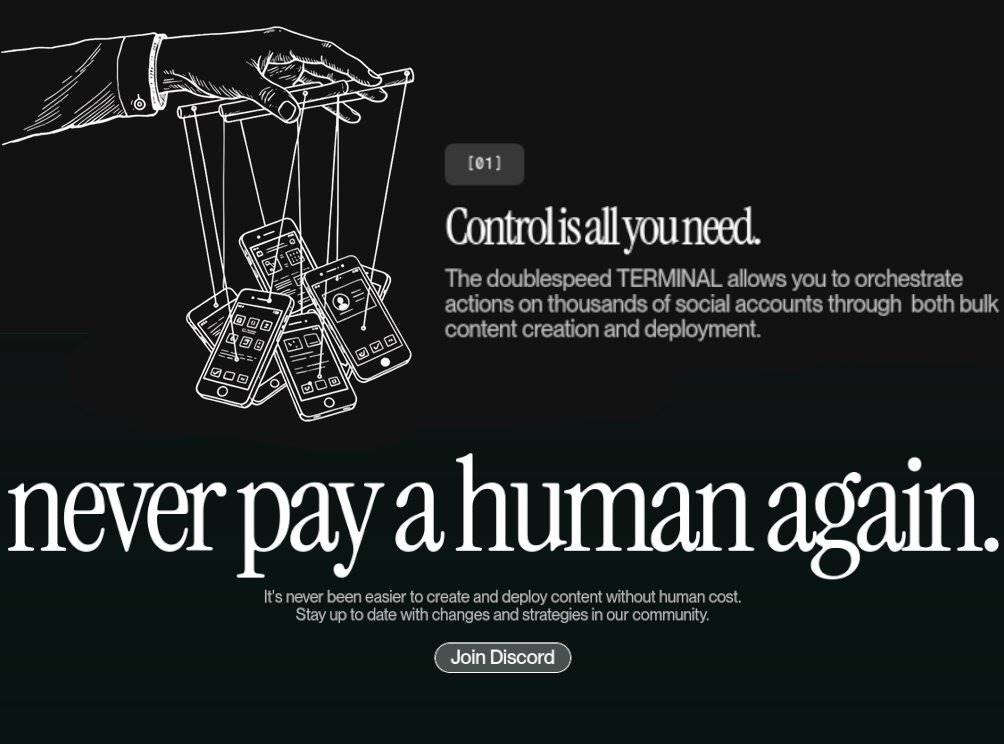 其中一家投资组合公司展示了这一媒体机器的逻辑终点:DoubleSpeed(@rareZuhair)。这家公司利用人工智能控制数千个社交媒体账号,并确保这些账号的行为“尽可能像真人”。其宣传口号直白而大胆:“再也不用雇人了。”