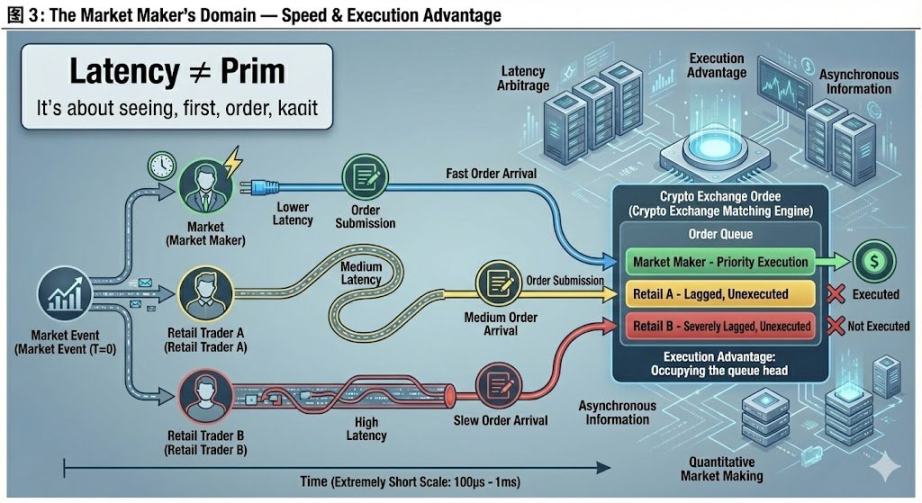 Latency Arbitrage 并不是预测未来价格,而是在别人「还没反应过来之前」,以更优惠的价格成交买卖单。在理论模型中:价格是连续的,信息是同步的。但是在现实中:市场是事件驱动,信息是异步到达。信息为什么会异步到达?因为你接受交易所的价格信号,和向交易所发订单指令都需要时间,这是物理世界的限制。即使在完全合规的市场中:不同交易所,不同数据源,不同撮合引擎,不同地理位置都会导致延迟。所以拥有更先进设备的 mm 就有主动权。