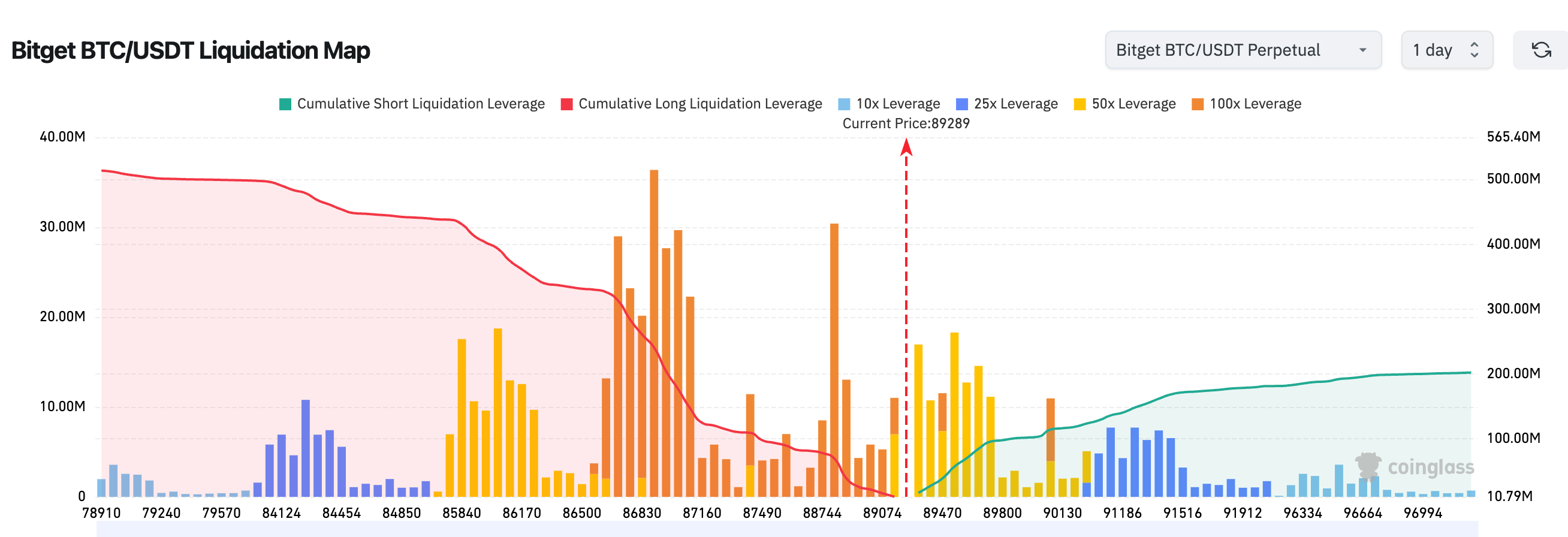 3、Bitget BTC/USDT清算地图显示:当前价格约 89,300 附近正处于多空清算密集交汇区,上方 89,500–90,000 区间聚集大量高杠杆空单,一旦突破易引发空头踩踏式拉升。下方 87,000–88,000 区域多头杠杆集中,若跌破将触发连锁止损,短期行情处于“上下皆易被扫”的高波动博弈阶段。