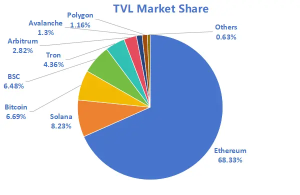 按公链进行划分,其中TVL最高的三条公链分别是Ethereum链,占比68.33%;Solana链,占比8.23%;Bitcoin,占比6.69%。