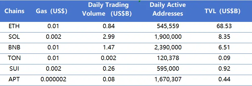 主要从链上DEX日成交量、日活跃地址、交易费用分析目前主要Layer1含ETH、SOL、BNB、TON、SUI以及APT的相关数据。