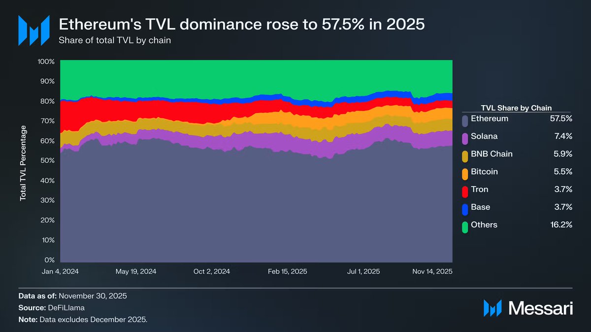 2025 年,ETH 在链上活动、稳定币结算、RWA 承载等关键指标上依然占据绝对主导地位。