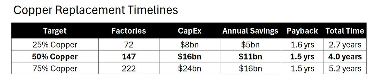 当白银价格达到 125 美元/盎司时,铜替代的回报周期将缩短至不到一年,到那时,每一次董事会会议都可能围绕铜替代展开讨论。然而,即使所有企业明天就做出决定,距离实现 50% 的铜替代仍需 4 年时间。同时,125 美元/盎司的价格比当前现货价格仍高出 50%。