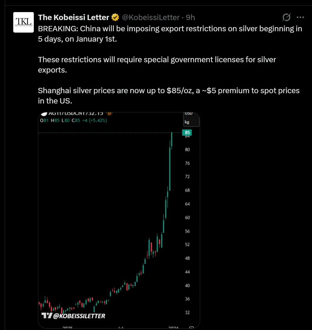 从 1 月 1 日起,中国将对白银出口实施许可证制度。这一点至关重要,因为中国是全球精炼白银的主要净出口国,每年出口约 1.21 亿盎司白银,几乎全部通过香港流向全球市场。