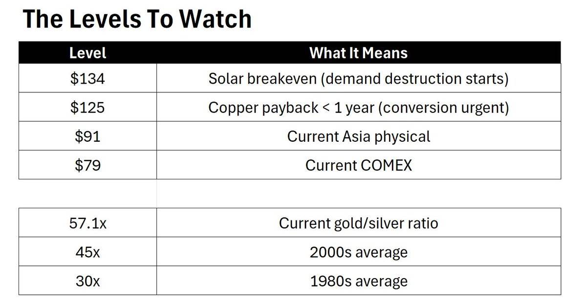 白银价格达到 134 美元/盎司时,需求破坏才会开始显现。这一价格比当前的现货价格还高出 70%。