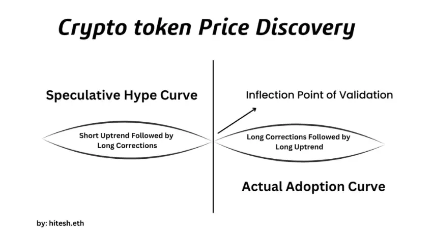 无论宣传叙事多么天花乱坠,所有加密代币都遵循着相同的价格发现周期。周期始于「0–1 阶段」:此时炒作占据绝对主导,实际应用率几乎为零。价格仅凭市场情绪一路飙升,社群围绕着虚构的「未来蓝图」形成,宣传话术的声势彻底盖过现实。随后,残酷的回调如期而至 — — 这会淘汰掉意志不坚定的持有者,也会揭穿那些只凭一句「承诺」就盲目入场的投资者。
