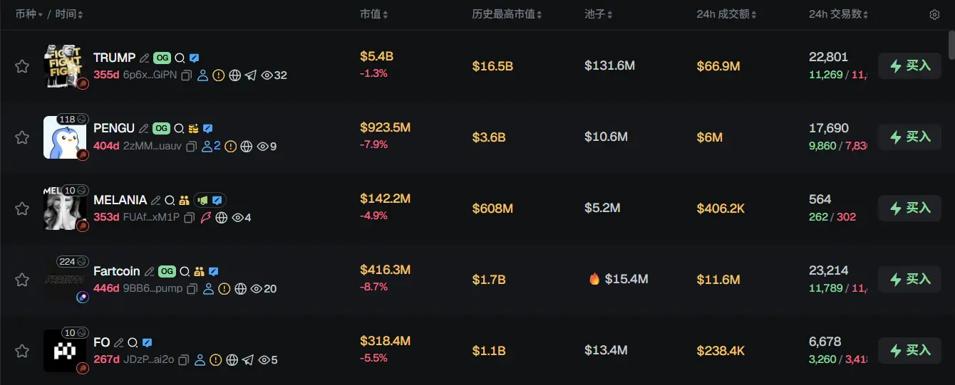 过去 24h Solana 热门代币前五依次为:TRUMP、PENGU、MELANIA、Fartcoin、FO