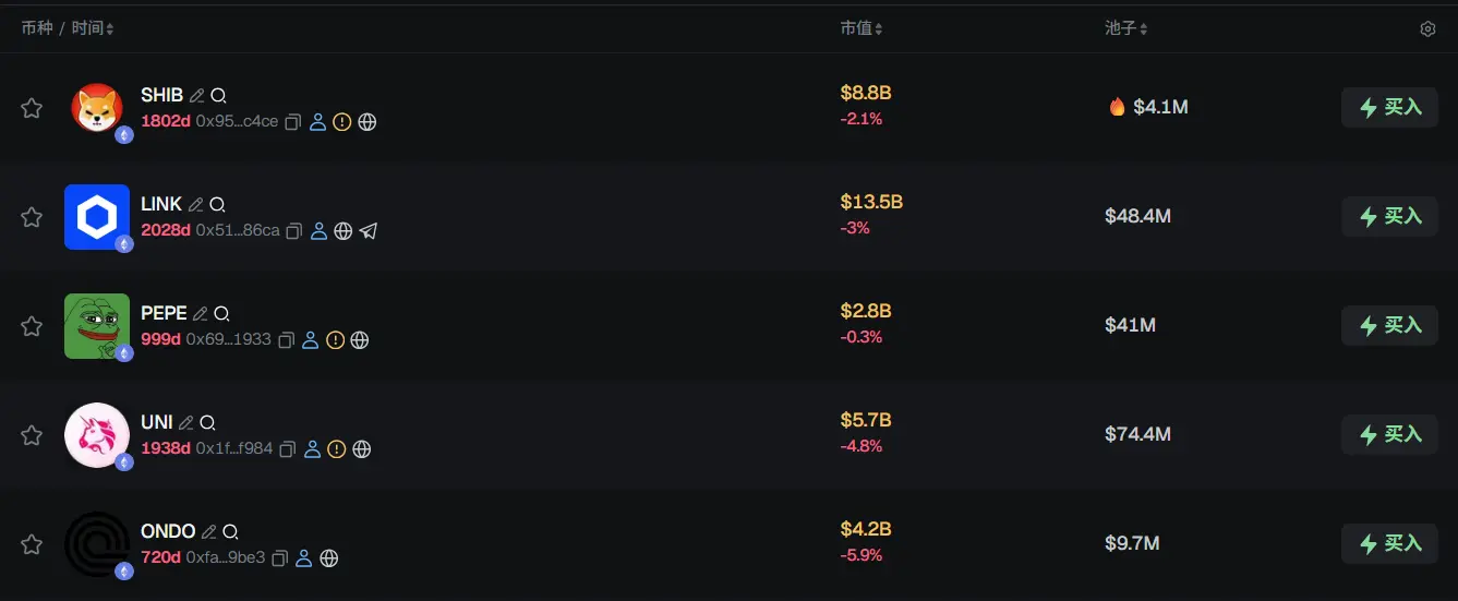 过去 24h ETH 热门代币前五依次为:SHIB、LINK、PEPE、UNI、ONDO