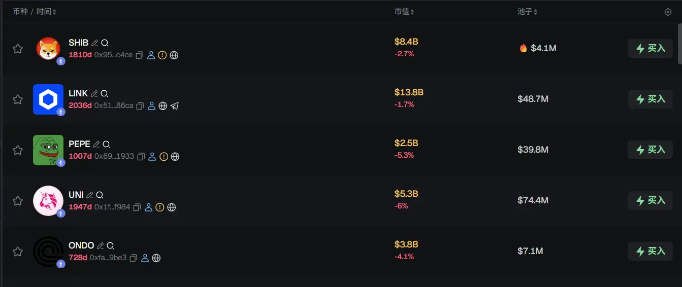 过去 24h ETH 热门代币前五依次为:SHIB、LINK、PEPE、UNI、ONDO
