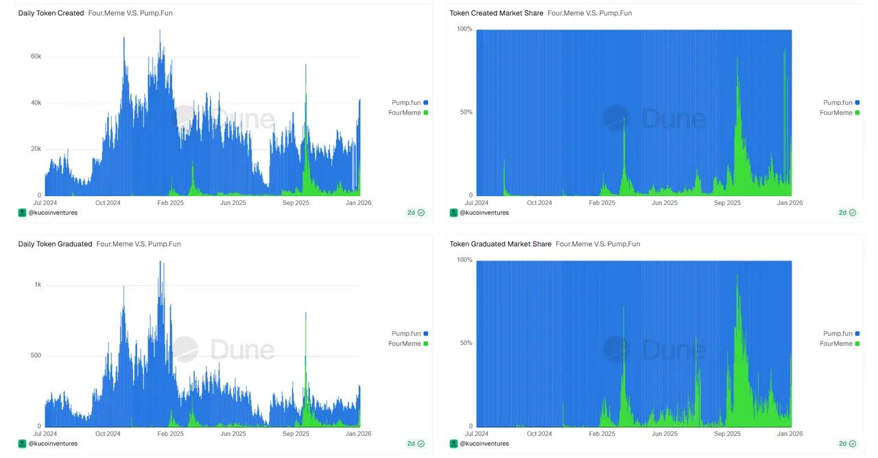 自2024年Pump.fun在Solana上线并掀起“Meme之夏”以来,Meme代币成为链上最火爆现象。该平台极大降低了发币门槛,尽管毕业率不足2%,但一度贡献Solana约70%的新币发行,助推Solana活跃度达顶峰。2025年初,开始主动拥抱 Meme 热潮,TST、Broccoli相关代币,mubarak等带动Four.meme流量飙升。进入2025年中,Solana和BSC之间形成资金轮动,BSC在第四季度借“中文Meme”爆火,如“币安人生”、“哈基米”带动跨文化FOMO;但10月底开始多数项目跳水归零。2026年初,“我踏马来了”、“人生K线”、“老子”、“黑马”等中文Meme再度暴涨,但后劲明显不足,目前已较高点大幅回撤。