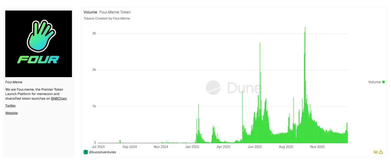 BSC链的Meme交易量则在2025年10月前后多次创出新高:2025年10月7日BSC链Meme币相关交易量飙至约 60.5亿美元。Four.meme自身在10月日均交易额也达到上千万美元级别,与Pump.fun旗鼓相当。不过BSC Meme交易呈现“火山喷发”式——短时间极端放量,然后迅速回落。例如2026年1月初中文Meme两天行情中,相关币种24H交易额暴涨数倍,随后又骤减超过50%。Solana Meme相对平缓持久一些,高峰期虽然也有巨量成交,但回落曲线较为渐进,平台收入直到2025年底都保持在高于熊市平均的水平。这反映出Solana Meme生态已经培育出一批常驻投机者,形成固定板块效应,不再完全依赖整体市场情绪波动。而BSC Meme生态还处在爆发-冷却的尝试阶段,季节性特征明显。