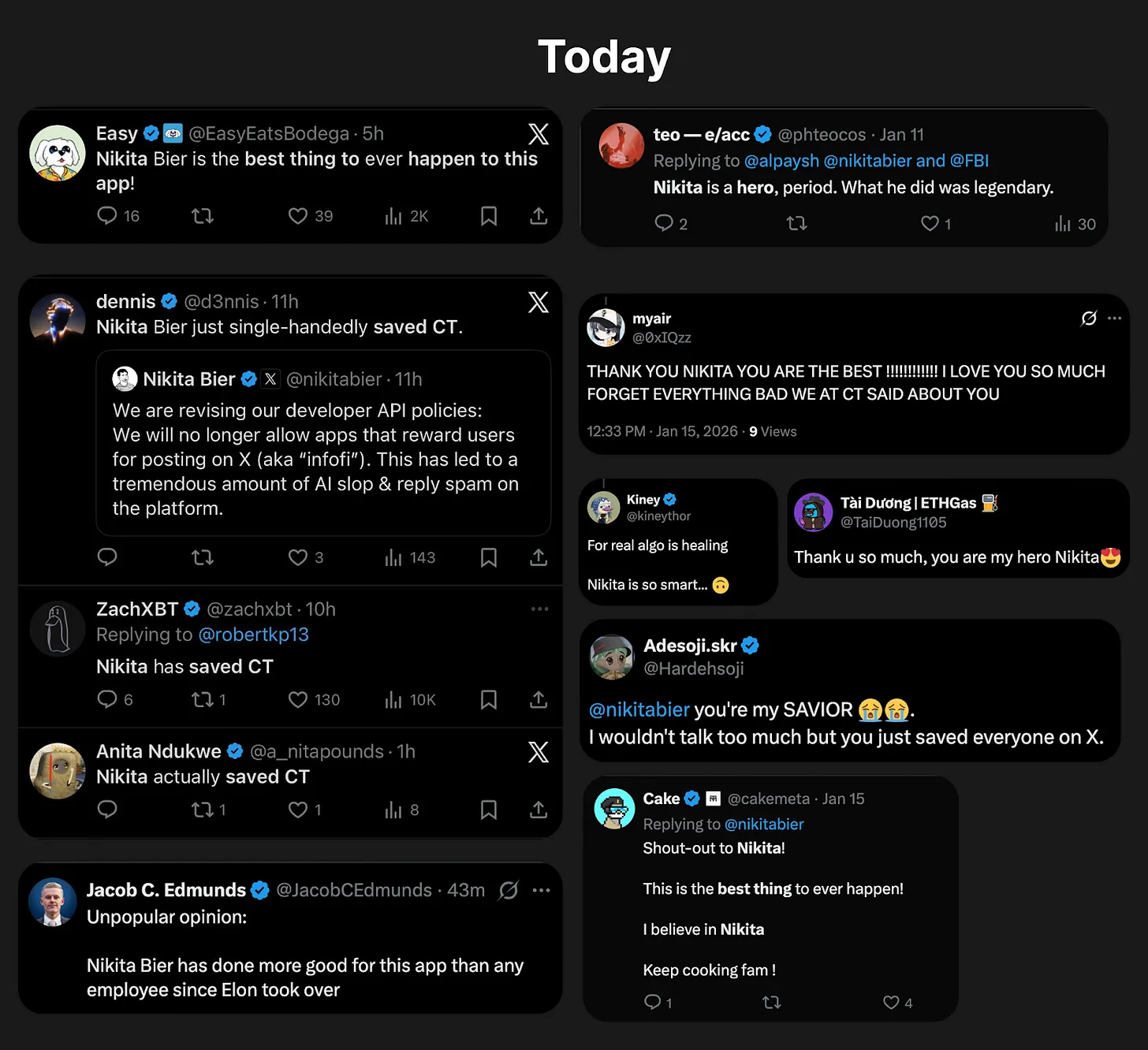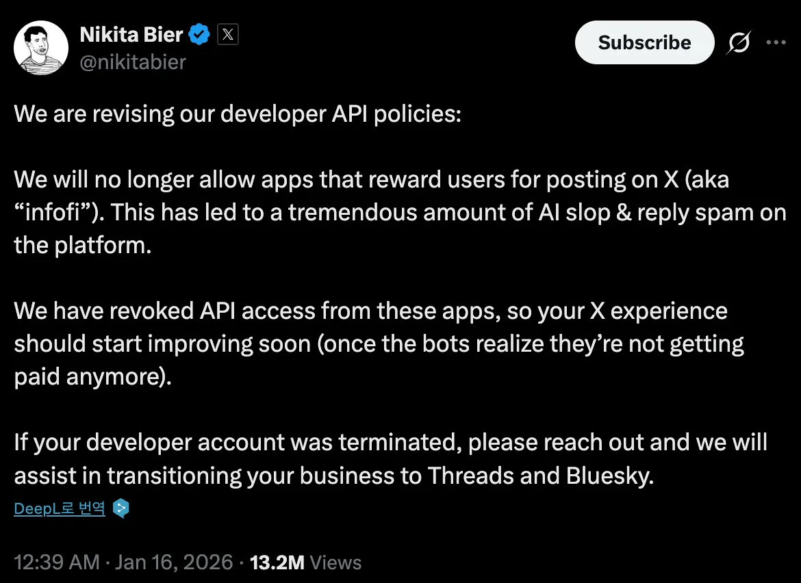 1 月 15 日,X 平台产品负责人 Nikita Bier 发布了一则简短告示,明确表示不再允许通过奖励诱导用户发帖的应用在平台上运行。对于 InfoFi 赛道而言,这无异于下达了“死刑判决书”。