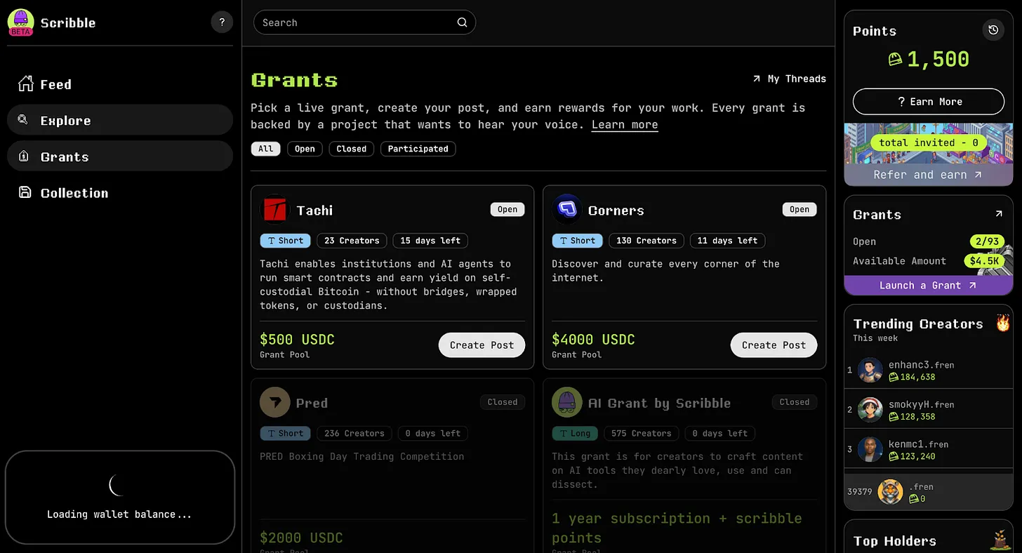 以 Scribble 为代表的模式就是一个典型例子。项目方以赏金形式发布资助任务,KOL 创建并提交内容供平台审核,审核通过后获得报酬。这是一种“先提交、后审核”的模式,而非依赖 API 的实时追踪。