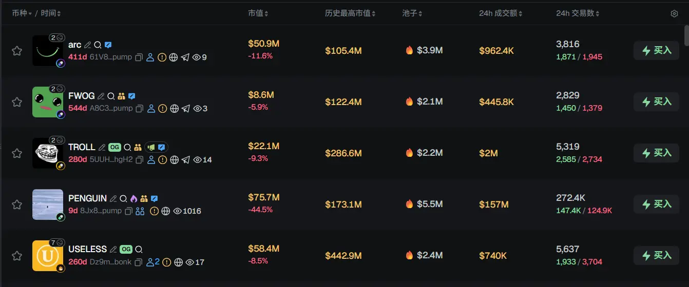 过去 24h Solana 热门代币前五依次为:arc、FWOG、TROLL、PENGUIN、USELESS