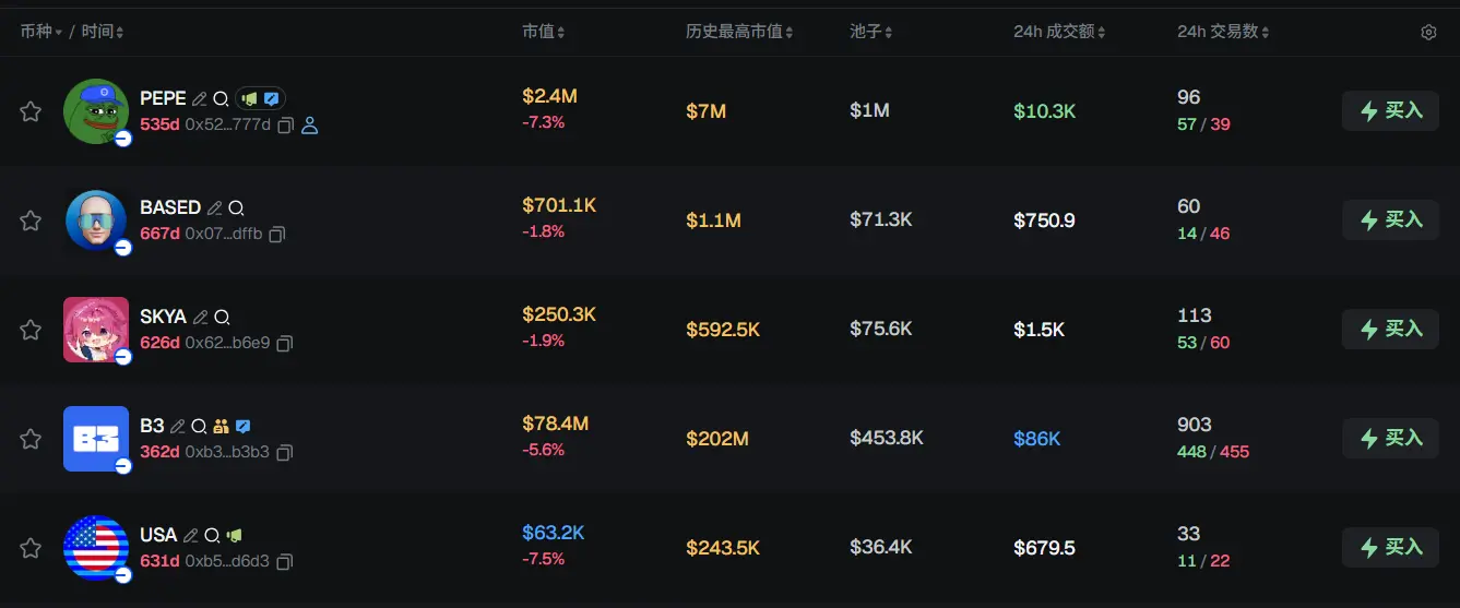 过去 24h Base 热门代币前五依次为:PEPE、BASED、SKYA、B3、USA