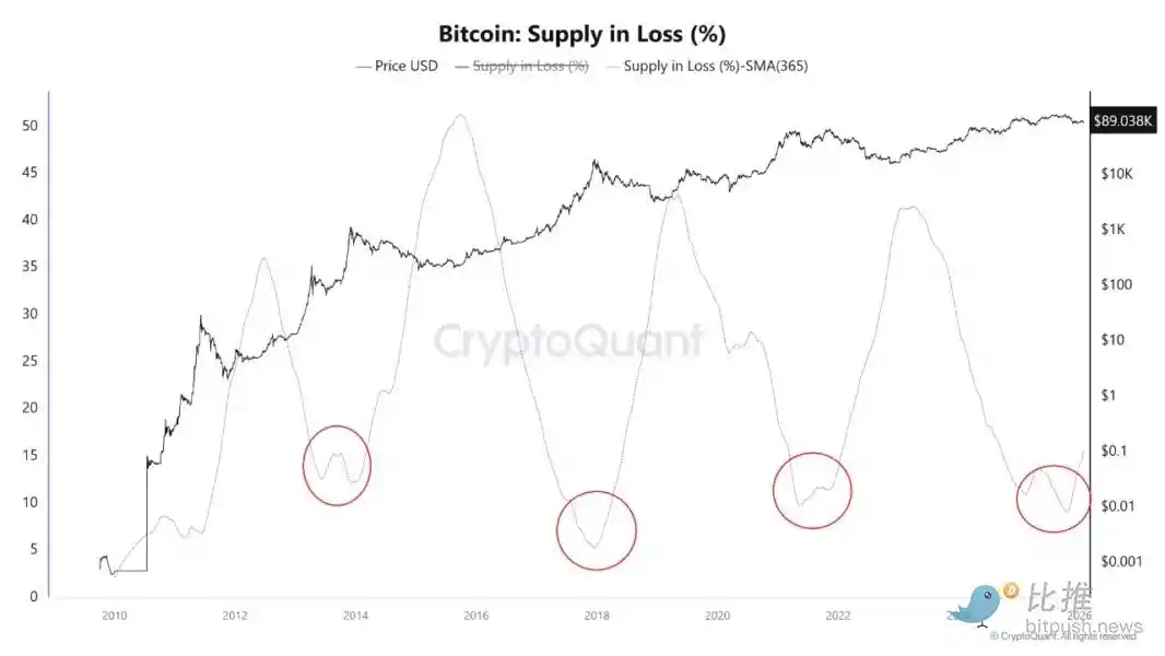 CryptoQuant 的最新分析显示,比特币「处于亏损状态的供应占比」(Supply in Loss)的 365 日均线正在重新上行。这一指标用于衡量当前价格低于其最近一次链上转移价格的比特币占比,是观察市场结构变化的重要工具。