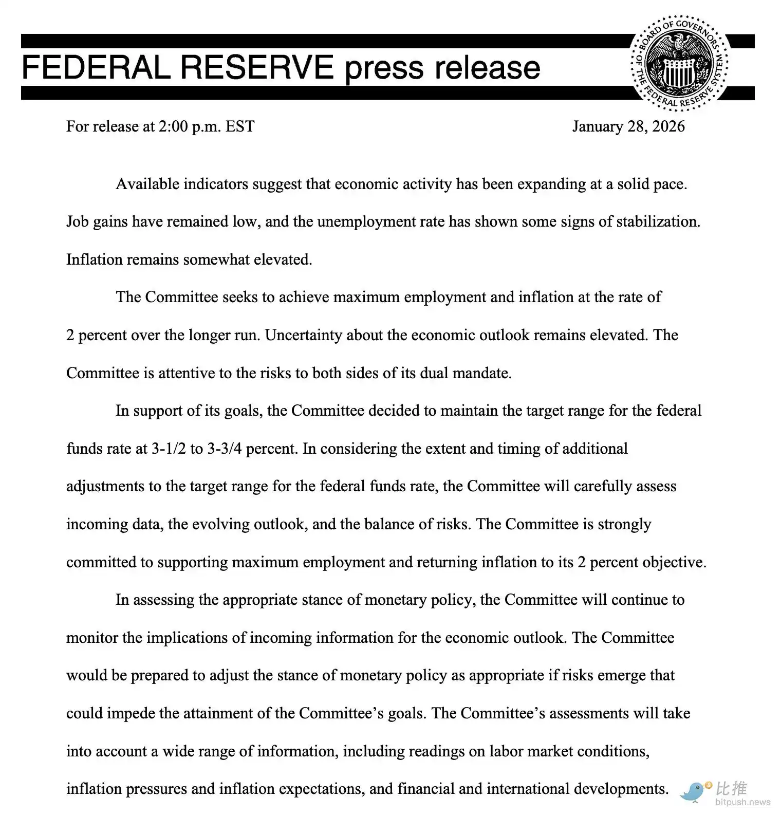 北京时间周四凌晨,美联储宣布维持基准利率在 3.5% 至 3.75% 区间不变。这份略显「平淡」的决议符合市场高达 97% 以上的预期,但也透露出政策内部的细微裂痕:两位美联储理事投下了反对票,支持继续降息 25 个基点。